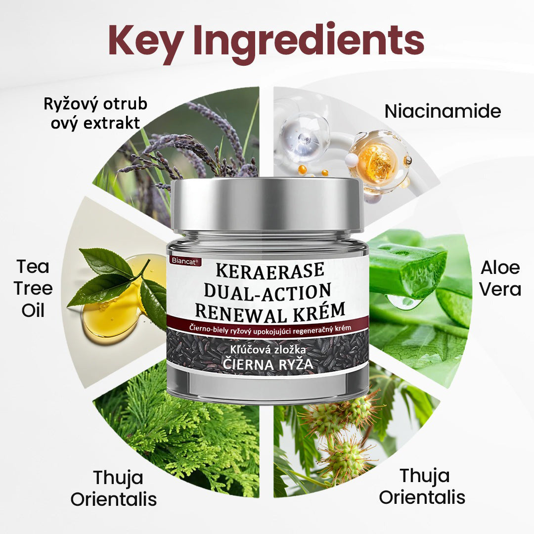 Preto sme vytvorili obnovujúci krém Biancat® KeraErase Dual-Action – jemné rastlinné zloženie, ktoré zjemňuje výrazné hrbolčeky, rozkladá hlboko usadené keratínové usadeniny a zosvetľuje odolné tmavé škvrny – to všetko bez kyselín, štípania, olupovania alebo podráždenia.